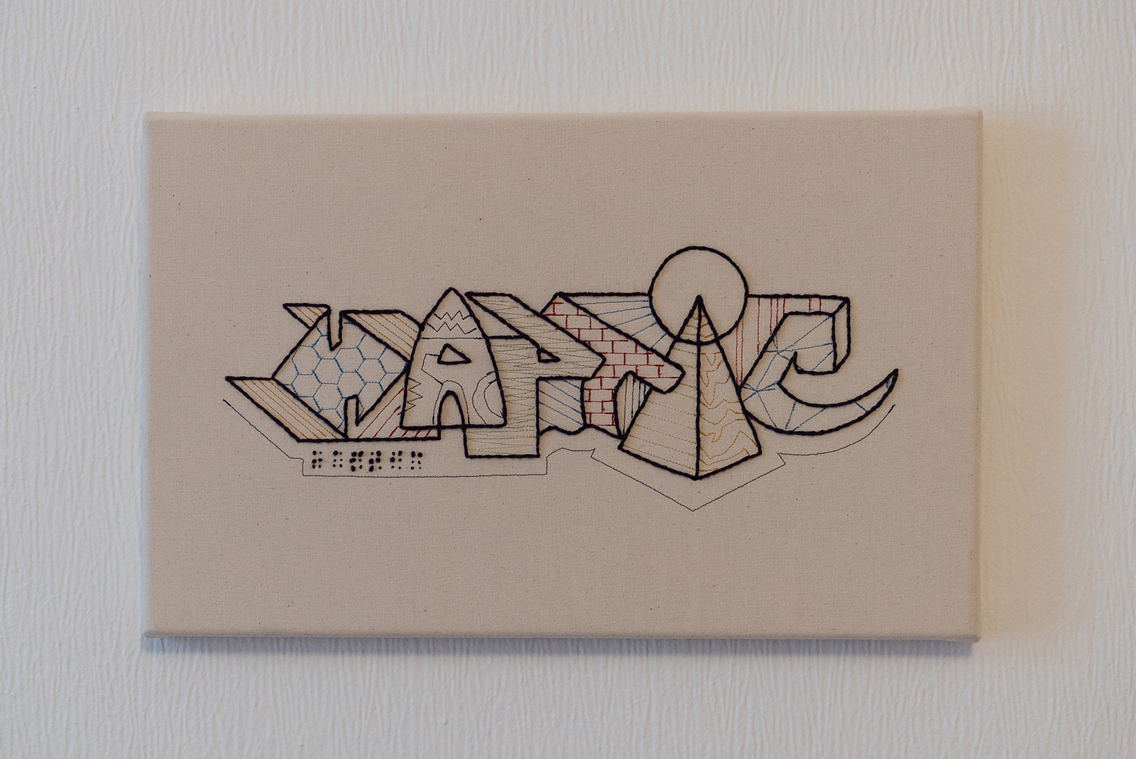 Haptic Graffiti, the fill in is made with a sewing maschine and the outline and Braille is embroidered. 25x40cm 2019